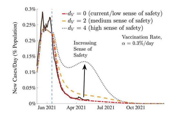 টিকাদানের ঊর্ধ্বগতির কারনে যারা টিকা নেননি তাঁরা নিজেদের কিছুটা হলেও নিরাপদ বোধ করেছেন। এর কারনে টিকা প্রক্রিয়া আরম্ভের সময় সংক্রমনের সংখ্যা কিছুটা বৃদ্ধি পায় (সৌজন্যঃ ব্রাউন ইউনিভারসিটি)।